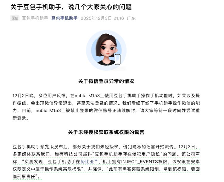 红星资本局12月3日报道,豆宝手机助手今晚发文,回应“微信登录异常”、“未经授权获取系统权限”以及用户隐私保护等问题。图片来自豆宝手机助手公众号。对于微信登录异常的情况,豆宝手机助手回应称,不少用户反映,在努比亚M153上使用豆宝手机助手操作手机功能时,如果涉及到运行微信,微信会出现异常,甚至无法登录。随后,手机助手操作微信的能力离线。目前,禁止登录努比亚M153的微信账号不再相互屏蔽。请稍等片刻,然后尝试重新登录。以往,然而豆宝手机助手预览版发布后,网络上流传着未经授权使用、侵犯隐私的消息。作为回应,做ubao手机助手回应称,不存在黑客行为。豆宝手机助手需要用户主动同意后才能调用相关权限并使用手机功能;该权限的用途在权限列表中明确披露。豆宝手机助手还表示,不会代表用户进行相关授权和敏感操作,并在使用该授权时建立了透明的管理制度。豆宝手机助手在执行较长的任务时,屏幕上会有清晰的提示,用户可以随时中断,掌控整个流程。如果您在运行第三方应用时遇到敏感权限,例如敏感的系统权限弹窗权限、支付链接、身份验证等,豆宝手机助手不会代用户执行相关权限和敏感操作。关于保护用户隐私的问题,豆宝手机助手提到手机助手不会在云端存储用户屏幕的任何内容。当用户向助手发出操作手机的指令时,助手必须阅读屏幕,否则无法完成用户的任务。但屏幕或操作过程将存储在服务器端,所有相关内容都不会进入训练模型,保证了用户的隐私和安全。公开信息显示,12月1日,ByTedance豆宝团队发布了豆宝手机助手技术预览版。据介绍,豆宝手机助手是公司基于豆宝App与手机厂商在操作系统层面合作的一款AI助手软件。中兴商城此前推出了一款搭载豆宝移动助手技术预览版的努比亚M153工程样机,并已发售。在之前的评测中,豆宝手机助手因其功能而备受关注比如订外卖、订机票、比价购物,甚至回复微信、在手机上运行小程序游戏。今晚,豆宝手机助手再次注明,本次发布为“技术预览版”,是面向行业和AI技术爱好者的探索性产品。有些功能和交互比较创新,目前业界还没有明确的共识。 “我们也在官方视频和销售网站上明确强调,该产品目前不面向普通消费者。”红星新闻记者 强亚贤 上一篇:校园里的捏玩具安全吗?